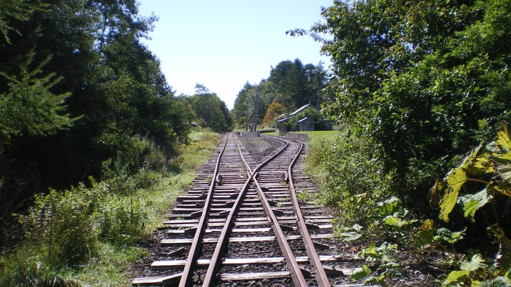 JR奥行臼駅跡と村営軌道跡はここに車を止めて歩く。線路がいまだに残っていて、砂利と枕木を踏みながら5分くらいで奥行臼駅跡に着く。ホームや駅舎、駅名板は当時のまま残されている。当時といってもJR北海道になってからなので、「歴史の里」というほど古くはない。
