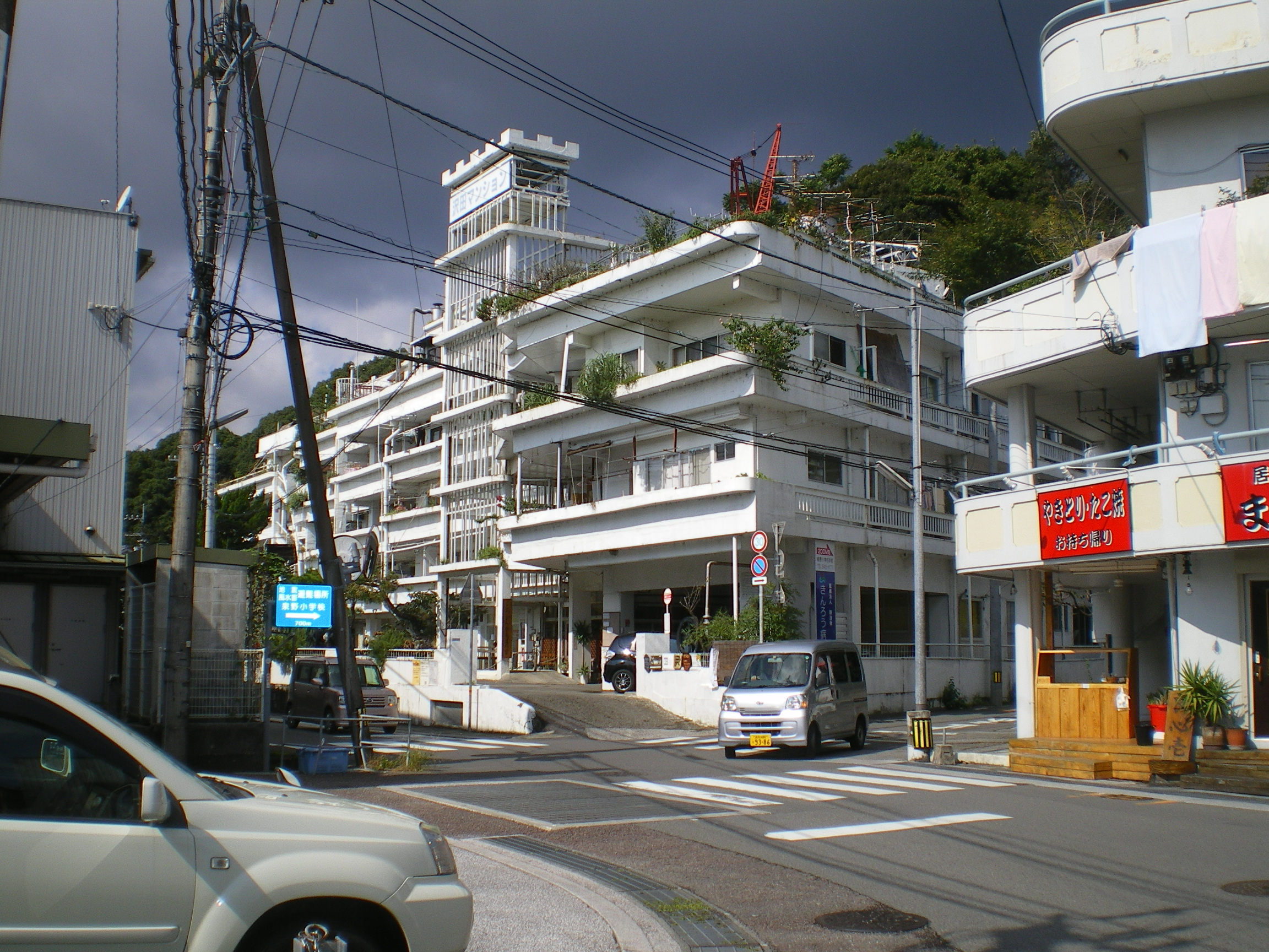 東から近づくと、細い柱を継いだ上に物見やぐらのような構造物が乗っかっていて、そこに「沢田マンション」と書いてあるのが見える。建物全体が抜けるような白でペイントされている。古いコンクリの建物だと、大抵カビとか苔が生えてうす汚くなっていることが多いのだが、こちらはきちんと手入れされているのだろう。