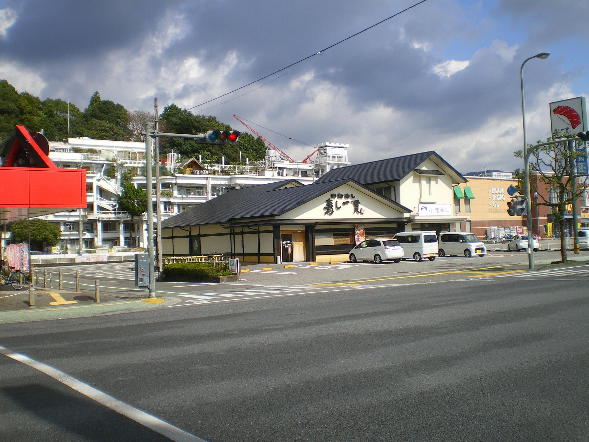 はじめ、高台から薊野(あぞうの)方面を遠望すると、コンクリに黒く苔が生えた建物が見えたので、あれが沢田マンションに違いないと思って近づくと全く別のビルだった。ただし、方向としては一緒なので、そのまま西に進むと沢田マンションになる。思ったよりも街中にある。すぐそばに片側2車線の県道が通り、洋服の青山やヤマダ電機、ファミレスなどロードサイド店が間近にある。