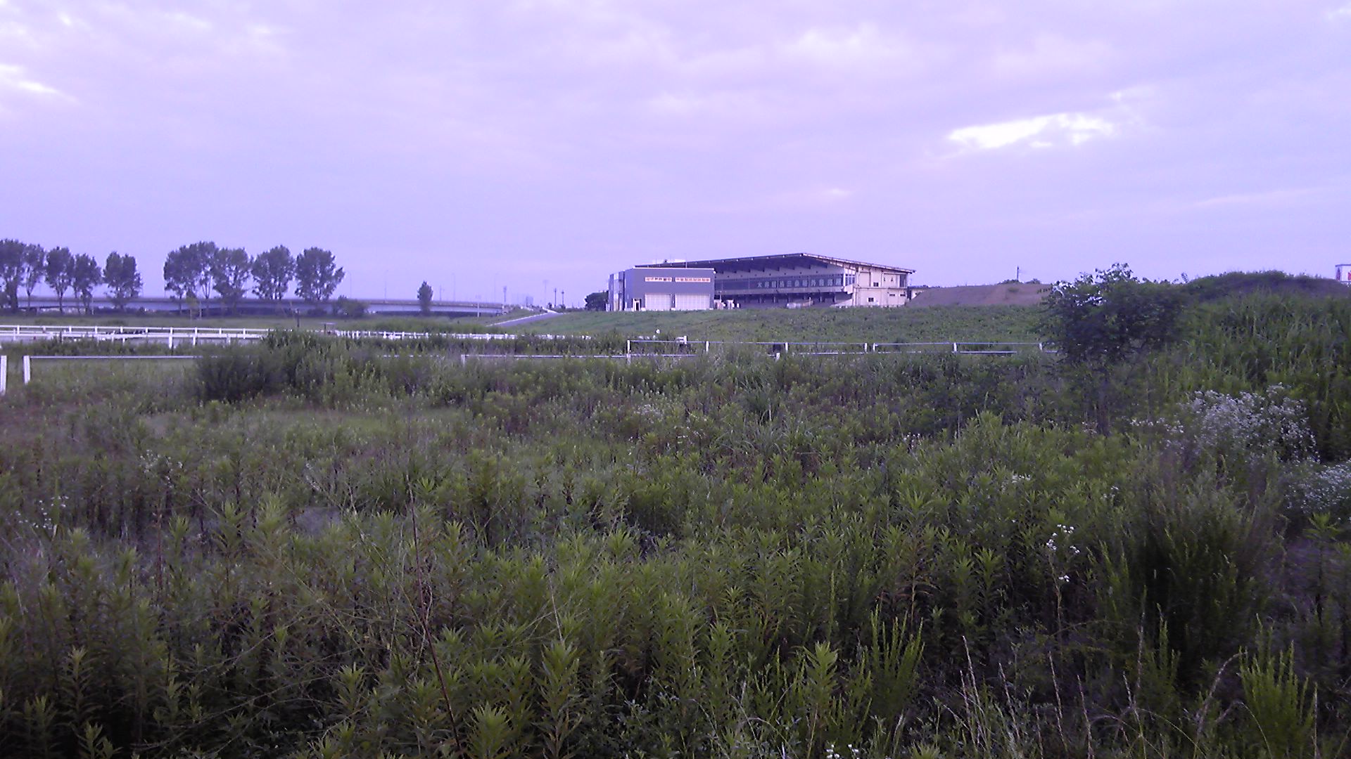 スタンド前から一段下がって、1周1000mのダートコース跡をひと回りする。いまやJRA新潟には1000m直線コースがあるから、今昔の感がある。JRAを見慣れていると1周は1800~2000mと思うけれど、地方で800mとか1000mは普通だった。それでも、2コーナー奥と思われる地点からだと、スタンドがかなり小さく見える。河川敷という土地柄、コースは平坦である。
