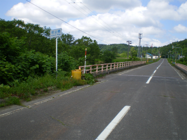 資料館を出て海岸沿いを少し戻った後、内陸部に向けて車を走らせる。左右は水田と牧草地が主で、人家が点々と続いている。10kmほどで古丹別(こたんべつ。また「別」だ)の街で、ガソリンスタンドや商店、学校、病院があるそこそこ大きい街である。ここから進路を南にとって、事件跡地に向かう。何とその名が「ベアーロード」、ところどころに熊のイラストが描かれている。