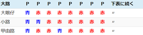 この時思ったのは、大路では3目以上下りていないし、小路の赤青青は3回続いているということだった。だとすれば、ここは小路の青、つまりBに一人だけ賭けることになったのだが、いまこうしてみると大眼仔の青は直前の赤より必ず少ないし、甲由路の青赤赤だって2回続いている。大眼仔の赤、甲由路の青つまりPだって、十分ありえるパターンだったのだ。結果は確かリャンピンサンピンの望みのない手で、最初の勝負手を外した。