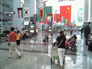 広州まで1時間強。かなり飛ばしたから100km以上はあると思う。広州市内は30階建て以上のマンションが立ち並び、まるで香港のような景観である。市内を抜けて山の中をしばらく進むと、前方にこれも香港国際空港とそっくりな建物が見えてくる。広州国際空港である。出発してから到着まで2時間20分。バスにはトイレなど付いていないし、休憩時間もないのでその点ちょっと不安であったが、ともかく広州までたどり着いた。