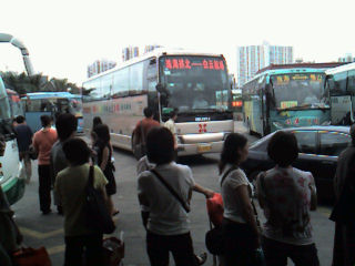 信禾バスターミナル。真ん中のバスが広州国際空港(白云机場)行き。外見はデラックスだが、中は大したことはない。