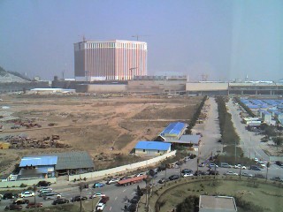 二日目はその新設カシノの中の一つ、金都(Grand Waldo)に泊まった。タイパ島の奥、コタイ地区に昨年できたカシノホテルで、これまでこの地区で一番奥にあった皇庭海景(マリナ・アンファンテ)の前を通ってさらに西側に進み、中国側との境に近いあたりにある。部屋から外を見ると、建設中の2つのホテル(ギャラクシーとベネチアン)と今後リゾートになるはずの埋立地が目の前である。