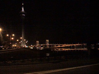 亜利加哩屋前からの夜景。マカオタワーと右側は南湾大橋。