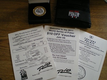 左から、WSOPシニアレシート、$10バウチャー、敗者復活トーナメント(w)のご案内。その上はお土産に買ったWSOPグッズ。