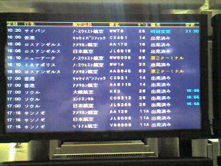 ノースウェストの出発する北ウイングに到着したのは8時過ぎ。再び顔を合わせた梶野さんが、「出発時刻10:20」の表示を見て、「ええっ、また遅延!?」と驚いたがこれは当初の出発時刻。変更21:30、搭乗開始は20:35の表示がある。いずれにしろまだ時間があるし、満席なのは分かっているから、とりあえず待合室でくつろぐ。退屈なので岡山のタギーに電話する。
