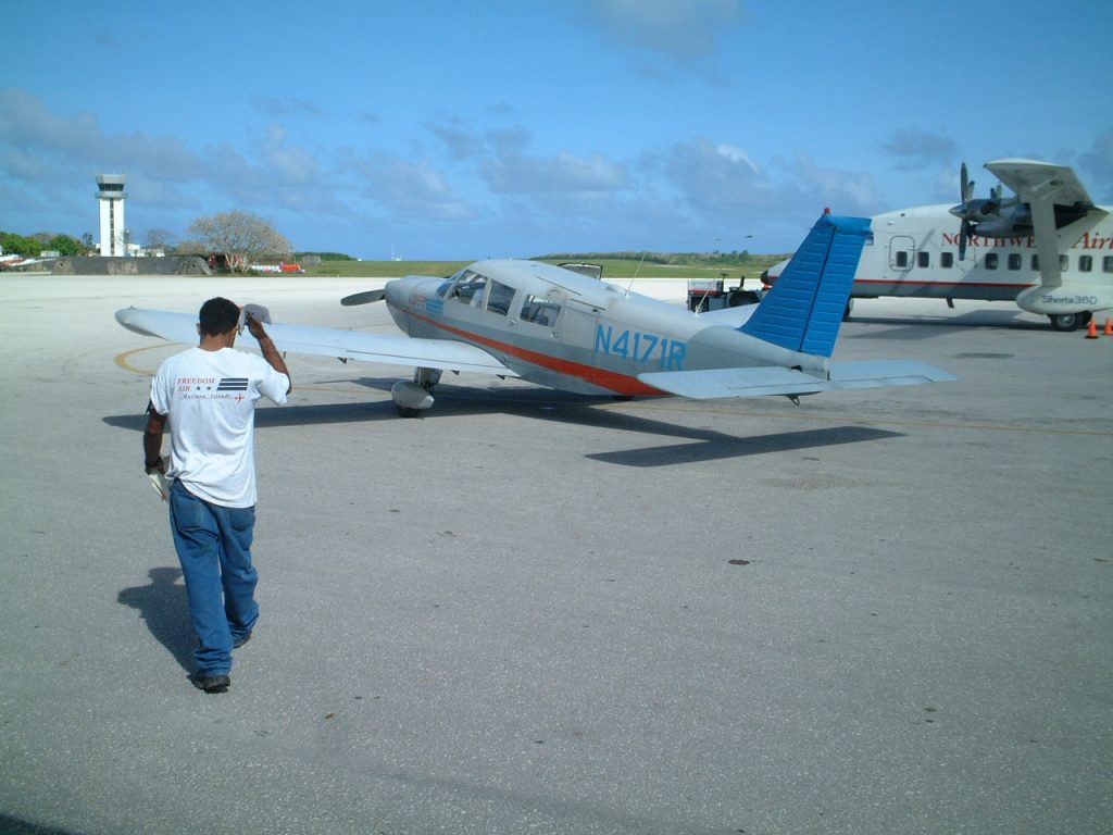 自分で搭乗手続きをする場合、入口を入ってすぐ右がテニアン行きの窓口なので、「Tinian,1person,One Way.」といえば、名前とか体重を聞かれるので答える。あらかじめ、紙に書いておくとあわてなくていい。体重はポンドなので、kgを2倍して1割増する。サバを読むと積載重量を超える場合があり、安全性の面で問題があるので注意しよう。料金は、前は30ドルでおつりが来たが、最近値上がりして30ドルに少し足さなくてはならなくなった。
