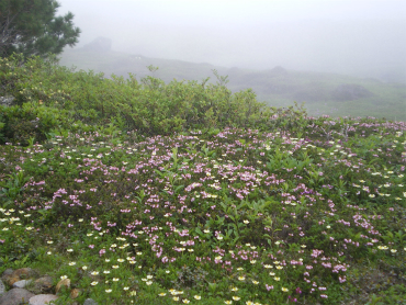 この時期は、チングルマ、メアカンキンバイ、エゾコザクラなど高山植物が開花して、白、黄、ピンクのかわいい花を咲かせています。が、ガスって見晴しはあまりよくない。