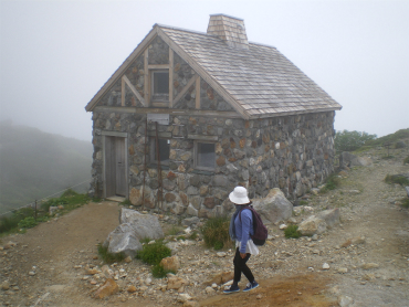 姿見の池に建つ、旭岳石室。避難専用なので、通常時は使うことはできません。