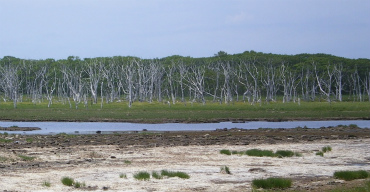 海の浸入はいまも続いていて、かつてのトドワラがこうであったろうと思われるのがナラワラである。ここは、ミズナラの林の中に海水が入ってきて立ち枯れているもので、下の写真に見られるようにまだまだ数多くの木を確認することができる。しかし、こちらも年々減ってきていることは間違いない。