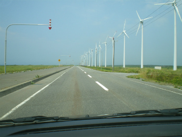 河口を過ぎると、今度は地平線まで何もないような土地に、風力発電のプロペラがずっと続いている。千葉の銚子近辺、茨城県にかけて同じようなプロペラが並んでいたと思って、帰ってから調べてみたら、どうやら同じ事業者がやっているようだ(ミツウロコグリーンエネルギー、HPこちら)。