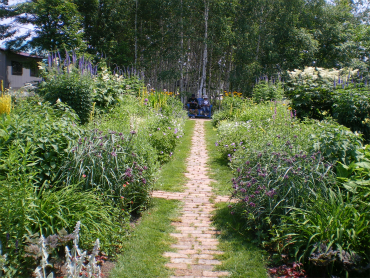 上野ファーム見どころの一つ、ミラーボーダー。通路の左右で同じ植物が植えられている。後方は白樺林。