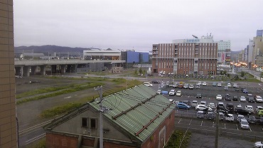 旭川東横インの窓から。中央やや左が現在の旭川駅とJRの高架。高架下の雑草の見えるところが昔の線路だったあたり。