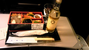 出発してしばらくすると、案内のお嬢さんがおしぼりを持ってくる。このあたりは飛行機と同じである。そして次は飲み物と食事。飲み物はビール、ワイン、日本酒、焼酎とソフトドリンクがあって、食事は洋軽食と和軽食がある。その他にお菓子とおつまみがあるとパンフレットには書いてあったが、持ってこなかったところをみると、リクエストベースなのかもしれない。
