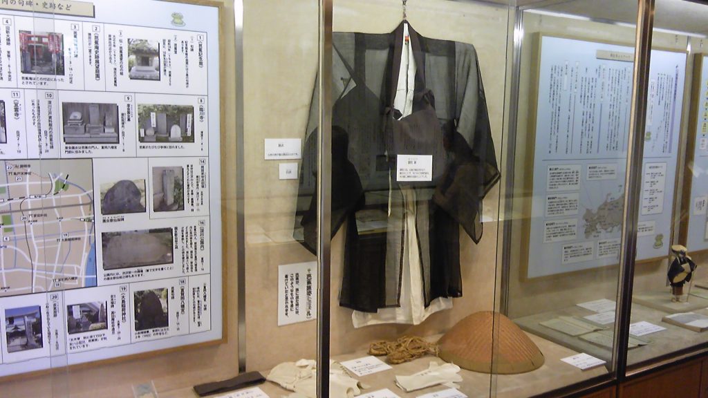 記念館は十連休中にもかかわらず開館していて、何人か見学者もいた。常設展示として道中笠や墨染めの衣、手甲・脚絆といった服装関係の再現や、代表的な紀行に関する説明資料がある。