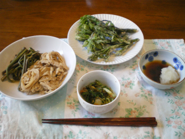 親水公園のおじいさんから買った山菜で、わらびと湯葉の煮付け、こしあぶらの天ぷら、のびるの味噌仕立て。春の香りが満載でした。