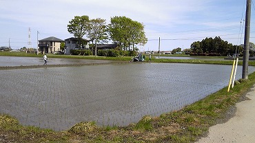 利根川デルタの栄町では、田植えの最中。このあたりは、機械化に対応して水田が長方形に区画整理されている。