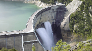 このトンネルを通るトロリーバスは15分ほどで黒部ダム駅へ。駅からは二百数十段(ということは標高で100mほど)の階段を登って、ダム展望台へ。展望台から黒部ダムと黒部湖を眼下にする。この時期は観光放水を行っているので、下の写真のように豪快な放水を見ることができる。