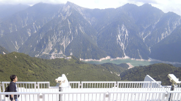 ロープウェイの上側、大観峰駅からは、いま登ってきた黒部ダムまでの景色がはるか下に望むことができる。ここは海抜2300m、黒部ダムは1450m。はるか下に見える。また向かい側にそびえている後立山連峰は、黒部ダム真上の赤沢岳が2670m、南に続く針ノ木岳が2820m。ほぼ目の高さである。