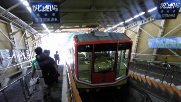 黒部ダムの上を富山寄りに歩いていくと、ケーブルカーの黒部湖駅。気のせいかすごく湿気がある。傾斜はすごい角度で、ぐんぐんと高度を稼いでいく。なお、黒部ダムまでのトンネルはもともとダム建設のために作られたため関西電力の運営だが、黒部湖から先は観光路線なので立山黒部貫光株式会社(観光ではないのがミソ?)が運営している。