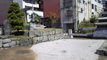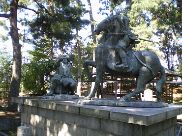 そしてもっとも古く見えるのが柴田勝家像。こちらは4人の女性とはちょっと離れて、床几に腰かけ前方を見据えている。この勝家を祭神とする柴田神社も、この一角にある。この柴田神社、建立は比較的新しく明治時代に入ってから。上にあげた福井藩最後の藩主松平春嶽らの発意によるものである。