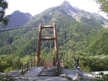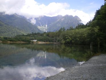 それにしても、梓川をはさんで穂高連峰の景色はすばらしい。TVではよく映る場所であるが、実際に見るのは初めて。頂上の方は雲に隠れて見えないが、何というか、登れるもんなら登ってみなさいと山が言っているようで、圧倒される。さすが日本を代表する景勝地である。