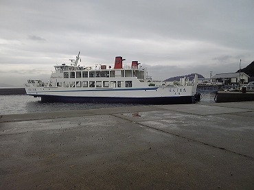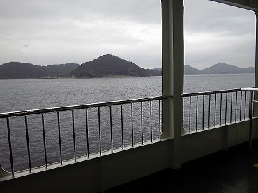 待合室でしばらく待つ。時間になったので切符を買って乗り込むと、200人以上は乗れそうな立派な船である。ただし、乗客は10人くらいしかいない。大音量でNHKのテレビを放映しているので国会中継が非常にうるさいが、デッキに出るとまだまだ海風は冷たい。仕方なく、船室内に入る。