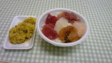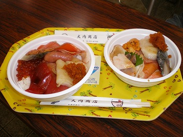 さて、この勝手丼。市場の中に何軒かある弁当屋さん(惣菜屋さん)で、まず丼飯を買う。大きさは小さいものから特大までいろいろで、ご飯も普通のとすし飯があって、すし飯の方が20円高い。そして、魚屋さんに行って、具を自由に選んで乗せるのである。1品100円から500円くらいまでいろいろあって、たくさん頼むと負けてくれる。
