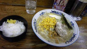 味噌バターコーンラーメン+ライス。奥の胡椒入れがキャバクラの宣伝というのは、いかにもすすきの。
