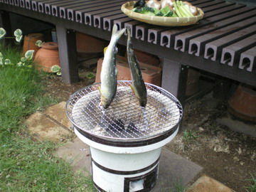 鮎は遠火の炭火で、串に差して立てて焼くとおいしいが、これは余分な水分や脂分が口から刺した串を伝わって出て行くからである。そこで、串をアルミホイルで巻き、立てて焼こうとしたのだが(写真)、中身が木であるから途中から串が燃え出してしまった。結局、普通に魚を焼くときのように網に乗せたため、水気が皮に出てきてしまい少しべちょべちょな焼き上がりになってしまった。