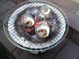 中の身を引っ張り出して切っておくと食べやすいのだが、そのまま焼いてかぶりつくのもおいしい。下ごしらえもしなくてすむので、そのまま焼くことにした。網の上にさざえを乗せる。しばらくすると中の水が泡立って沸騰してくる。ちょっとかわいそうだ。