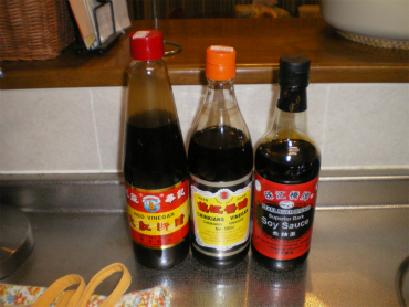 香醋は日本では「黒酢」といわれるものに近い。ちょっと見はたまり醤油のようで、実は酢である。紅醋は香港・マカオではポピュラーで、わが家では「赤酢」と呼んでいる。ギョーザにつけてもおいしい。老抽はあちらのたまり醤油で、あまりしょっぱくなく、ねっとりした感じである。あと紹興酒、豆板醤、中華スープも使うが、これらは日本のスーパーでも売っている。
