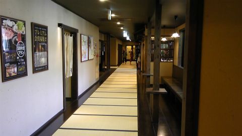 館内は畳敷きの廊下が浴室まで続く。平日のお昼なのに、レストランは満員で入れませんでした。