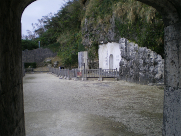 この三角形のトンネルを抜けた高台から、東方海上への展望が開けている。はるかに望むのは、沖縄本島東方の久高島(くたかじま)である。おそらく、真夜中に神事を行い、ここから海から上がってくる日の出を拝んで、王朝の繁栄を祈ったのではないだろうか。