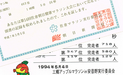 さて、マラソンの完走記録は平成5年(1993年)10月の白井梨マラソン(親子2km)、平成6年(1994年)5月の三郷アップルマラソン(10km)、10月の白井梨マラソン(5km)、平成7年(1995年)3月の佐倉朝日マラソン(10km)で、後の3つは転職後の大会である。