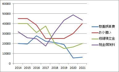 教養娯楽費(青線)は、月2万円の予算で考えていたのだけれど、コロナやら何やらでスポーツクラブをやめたので浮いてしまった。ご近所でも、コロナを機にやめてしまった人達は多い。
