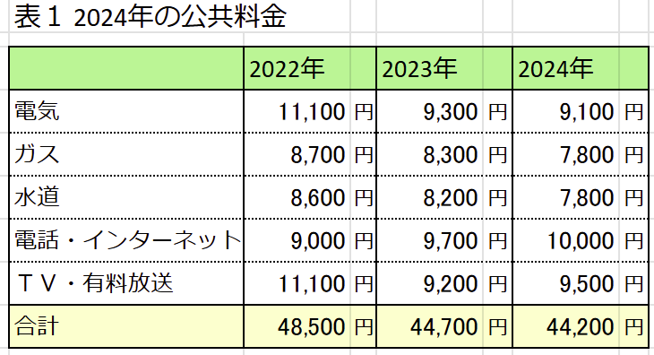 昨年7月からはてなブログに移ってきて、初めての正月になる。毎年1月初めには、前年の生活を振り返る「年金生活白書」をブログに掲載していて、リタイアしてから9度目の作成になる。例年に続き、今年もまとめてみる。 2024年の公共料金は、月平均44,200円。2023年は44,700円だったから。月500円の微減である。 わずかであっても、この物価高で増えないというだけでありがたい。2022年にウクライナ戦争によりエネルギー価格の高騰が始まり、月約4万円だった公共料金が一気に2割跳ね上がった。昨年・一昨年と落ち着いてはいるものの、実は2021年と比べると1割高い。 3年で1割がインフレかどうかという議論はあるが、現実に年金スライドは合計2~3%なので、負担は大幅に増えている。こうでないと年金財政は破綻するので仕方ないとはいえ、生活が苦しくなるのはつらいところである。 内訳をみると、まず電気代は9,100円(月平均・以下同じ)で前年比-200円、3.2%減であった。 使用量がほとんど同じなので(月平均で1.1kwhしか違わない)、単価はやや下がったということになる。一昨年暴騰したエネルギー価格も落ち着いて、政府補助も継続されたためであろう。ありがたいことである。 ガス代は7,800円。2023年比で-500円、-5.6%と電気代以上の負担減であった。ガス代も電気代と同様、使用量がほとんど変わらなかったので(月平均で1㎥増えた)、やはり単価が下がったということである。 フランスやドイツのニュースを見ていると、電気代・ガス代などの値上がりが生活を圧迫しているので、それに比べるとわが国の状況は比較的恵まれている。 水道代は7,800円。前年比-400円、4.9%減。これは節水に努めたというよりも、10月まで酷暑が続いたため、とてもお風呂に入る陽気ではなく、シャワーで済ます期間が長かった結果である。 シャワーにするような気温だと冷房を使わずにはいられないので、水道代は減るが電気代は増える。それで電気使用量が前年並みということは、節電したということでもある。 電話・インターネットは月平均10,000円。前年比+300円、3.8%増。はてなブログの有料プランで微増となった。来年はフレッツ光でさらに増加が見込まれ、頭が痛い。とはいえ、らーばんねっとがジェイコムになるので、いずれにしても値上げは避けられなかった。 TV・有料放送は9,500円。前年比+300円、3.1%増。NHKの受信料値下げで若干減ったものの、YouTubeプレミアムが増えて微増となった。こちらも来年はジェイコム移行で値上がりとなる。有料放送を整理してどの程度抑えられるか、厳しいところである。 以上、公共料金合計は月平均44,100円。電気・ガス・水道代の減少により、前年比-500円、1.2%の減少となった。節電・節水には引き続き努力するけれども、結局のところ気温によって電気代は大きく違ってくるから、あまり気負っても仕方がない。おだやかな気候を祈るばかりである。