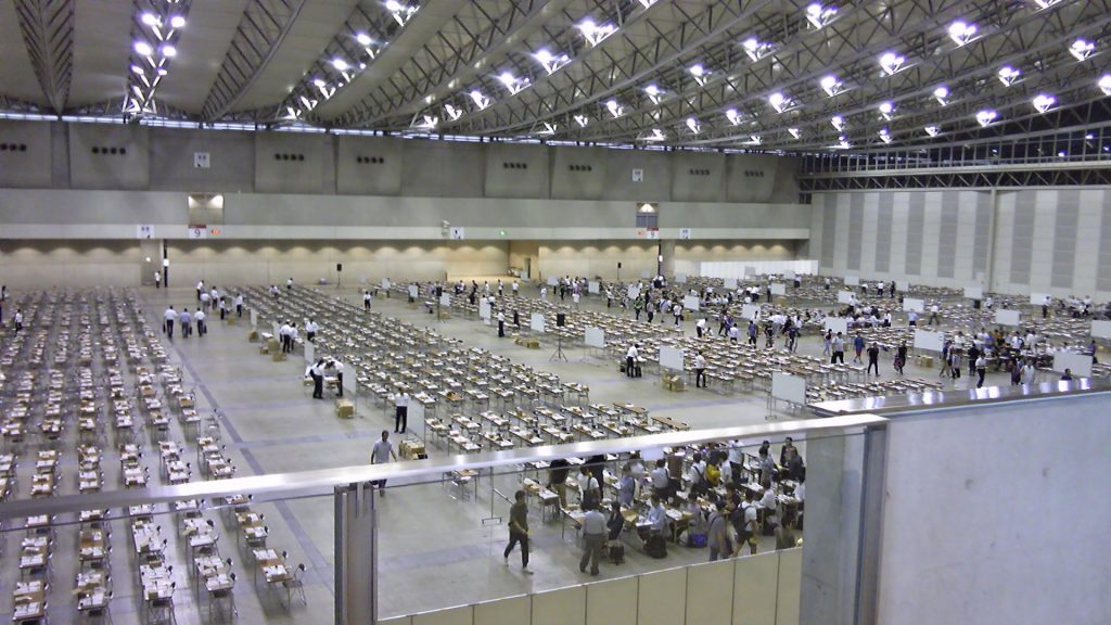 試験終了後の幕張メッセ国際展示場ホール。約2千人が、一斉に試験を受けたのは壮観でした。