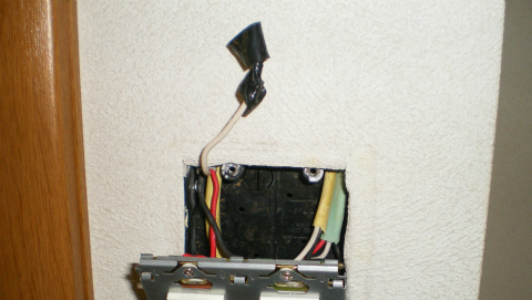 もっと驚いたのは、スイッチを取り換えようと枠を外した時である(写真)。VVFのカバーが見たこともない色(バチ物?)なのはともかくとして、ポーチライトから来ているVVF3心のうち、スイッチにつながっているのは赤と黒だけである。白線はというと、ビニルテープでぐるぐる巻きにしてどこにもつながっていない。