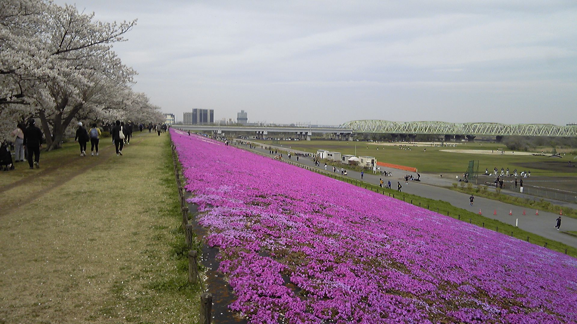 午前10時の時点では雲は厚いものの、雨は降っていない。マラソン大会以外にも、お花見の人達やグラウンドで野球する少年たちとその父兄で河川敷はにぎやかだ。桜も芝桜も見事に満開である。