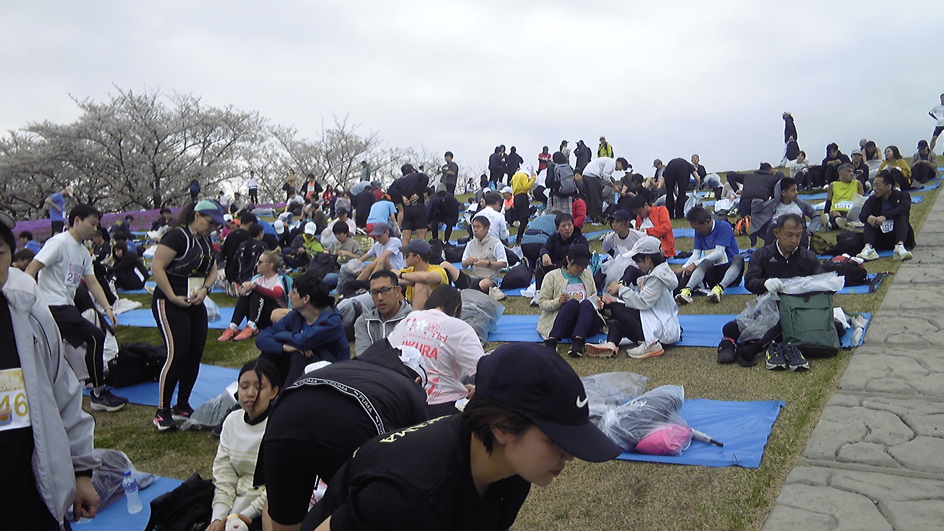 リュックの場所に戻ってゼッケンをランTに固定した後、持参したあんパンで栄養補給。その間に放送があった。「すぐに雨が降る予報です。お渡ししたビニール袋に荷物を入れて、濡れないようにして下さい」なかなか気が利いている。ゴミ袋を持ってきてあるが、ビニール袋は多いほど安心である。