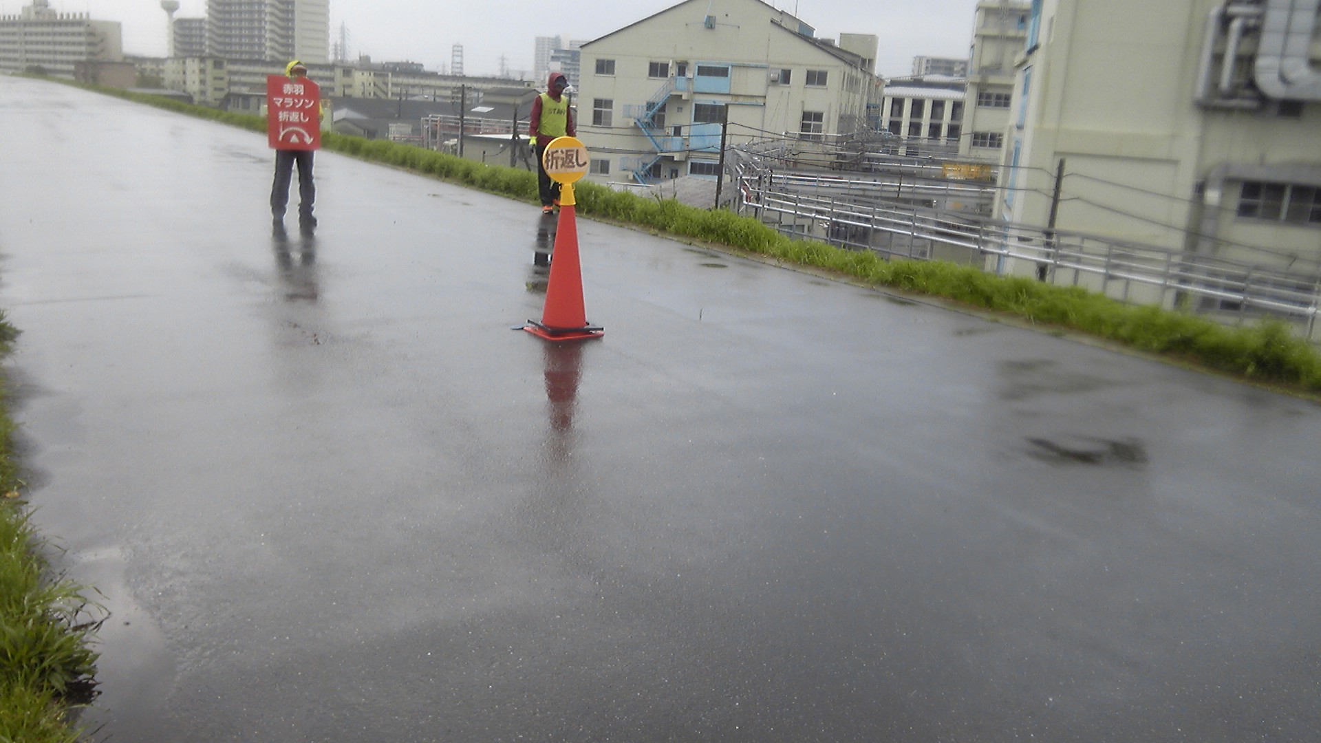 岩渕水門から数百m進むと東側の折返し。西側と同様、折返しの少し前に給水所がある。ここも給水は取らない。普段の練習でも10kmまでは取らないし、この日は気温が低く汗もかいていない。ただ、ランパンに入れてある汗拭きタオルはびしょびしょである。汗でなく雨のせいである。