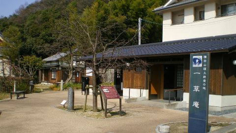 山頭火終焉の地、道後温泉から歩いて15分ほどの一草庵。現在は公園として整備されていて、こちらの建物はトイレ兼資料展示スペース、後方が昭和初めの建物を再現したものである。