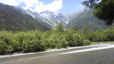 河童橋付近から岳沢・穂高方面。キャンプ場からもこの景色が見えます。