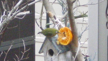 みかんを食べに庭に来るようになったメジロ。下の巣箱には興味がないようです。