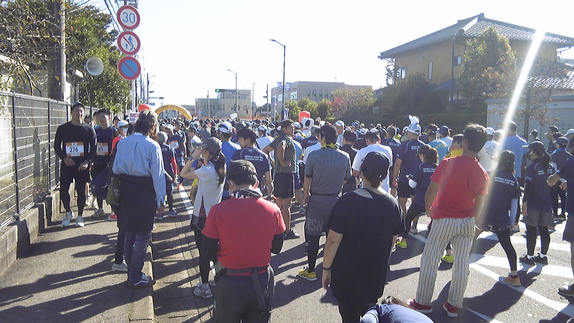 八街北小学校入口の角を右折して住宅地に入る。この先に、5km地点の第一折り返しと第二給水所がある。住宅地の道なので今までより狭く、前方は渋滞しているように見える。