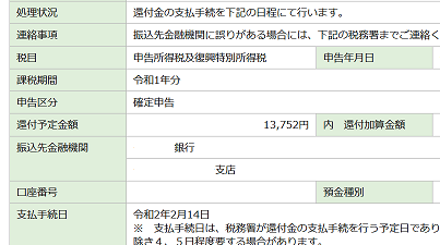 さて、一昨年の確定申告では申告から還付まで約3週間だったが、今年は2週間である。メッセージボックスに出るまで2週間かかるということであったので、13日にそろそろかなと思って照会すると、なんと14日還付予定であった。