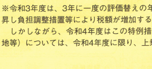 ところが、昨年はコロナ騒ぎがあったので、3年に一度の見直しで評価額が上がる(=固定資産税が上がる)ことになった世帯は、前年度の評価額から上げないという特例措置があったということである。